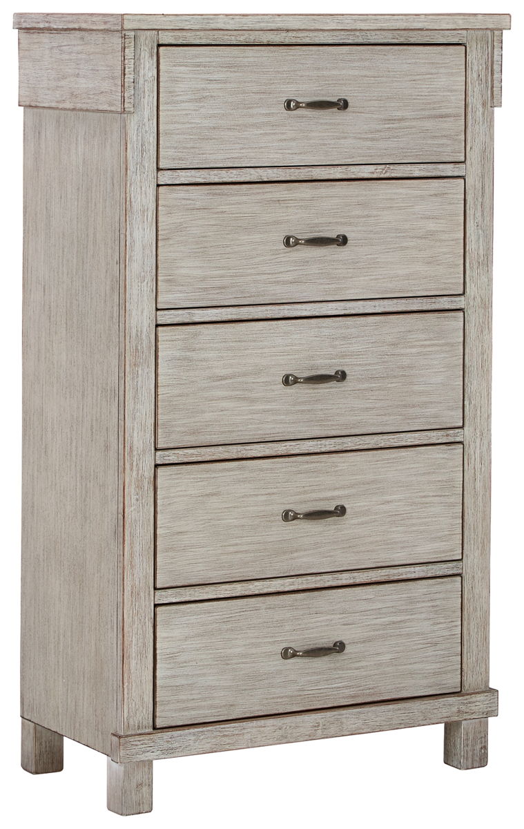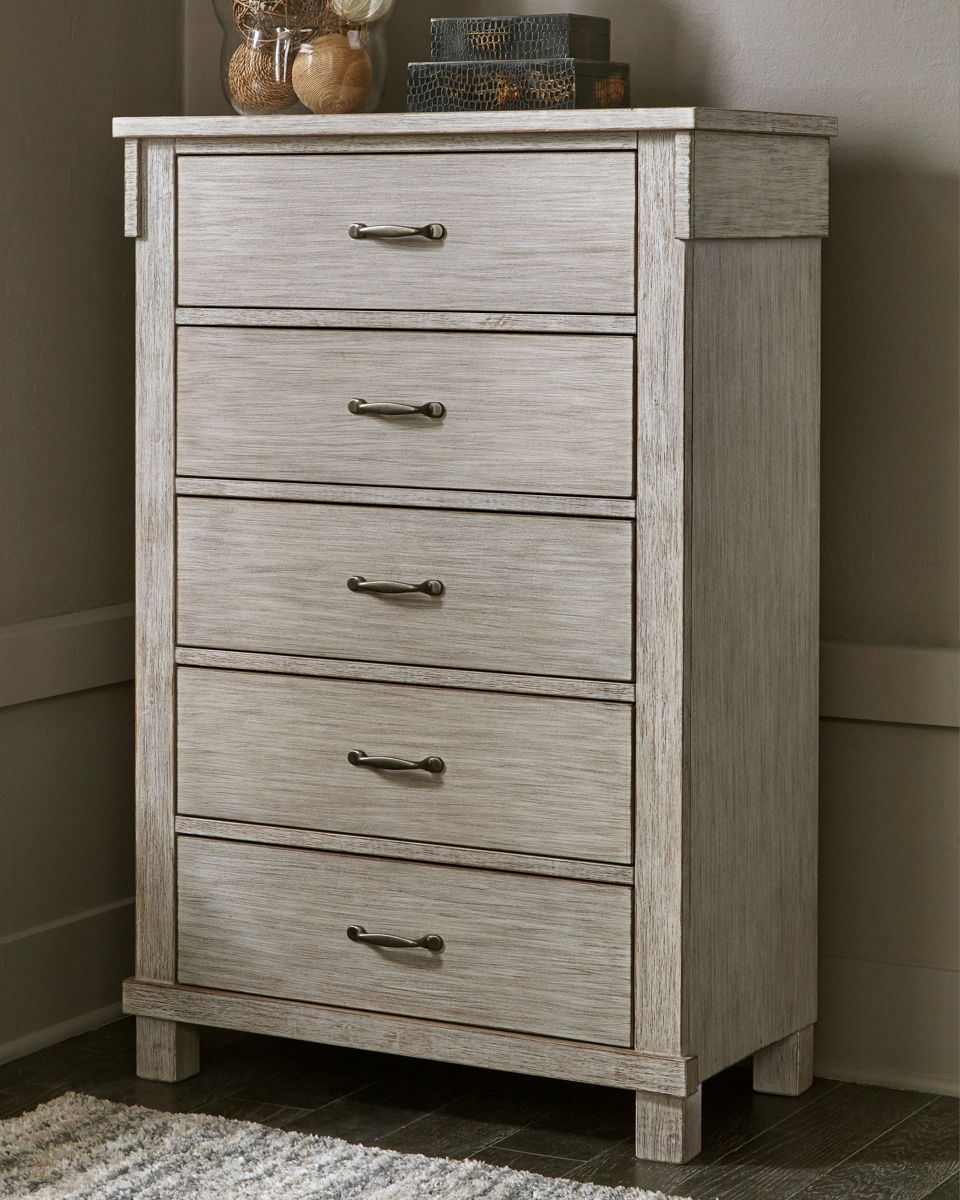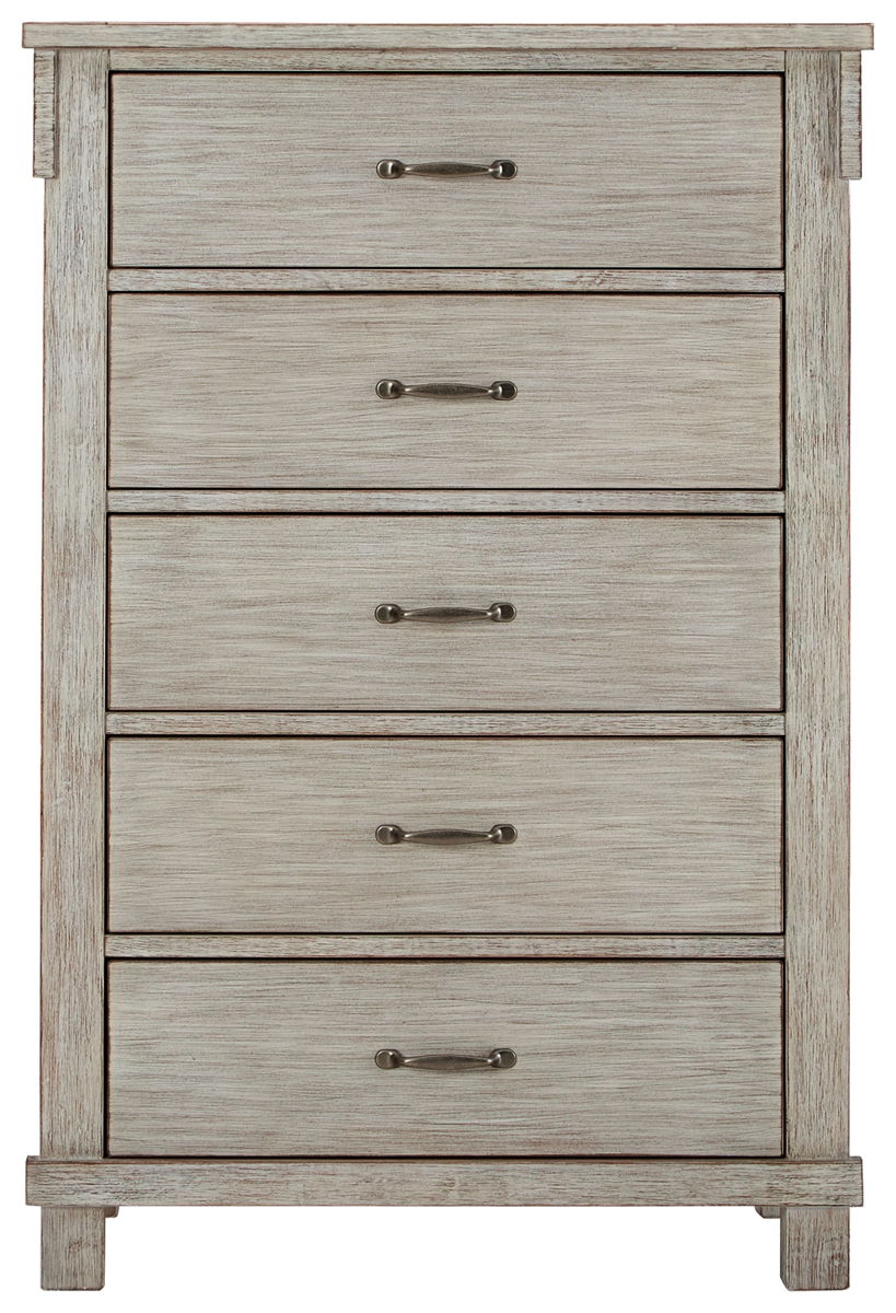 Enhance your bedroom with a touch of casual glitz. This chest of drawers’ rubbed white finish with a blend of rich texture and woody undertones is sure to please. The five smooth-gliding drawers feature dovetail construction for strength and durability. Chic bar pulls in a brushed nickel-tone finish are a brilliant touch.