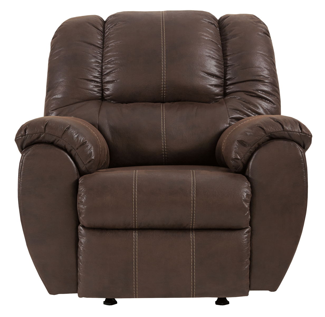 Rock the cool look of leather and the warm feel of fabric with this rocker recliner. Sporting sumptuously thick cushioning, fashion-forward jumbo stitching and a richly tailored aesthetic, this smartly priced recliner with gentle rocking motion is a bestseller for good reason.